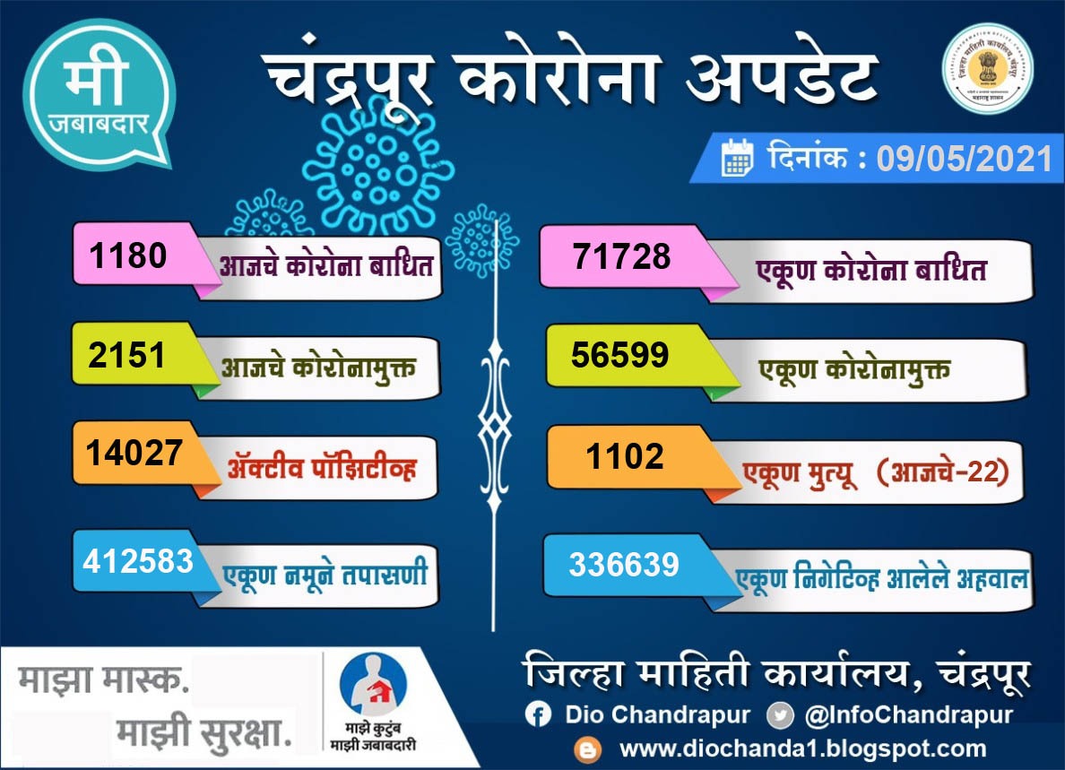 चंद्रपूर, दि. 9 मे : जिल्ह्यात मागील 24 तासात 2151 जणांनी कोरोनावर मात केल्याने त्यांना रुग्णालयातून सुटी देण्यात आली आहे, तर 1180 कोरोना बाधीत रुग्णांची नव्याने भर पडली असून 22 बाधीतांचा मृत्यू झाला आहे.