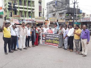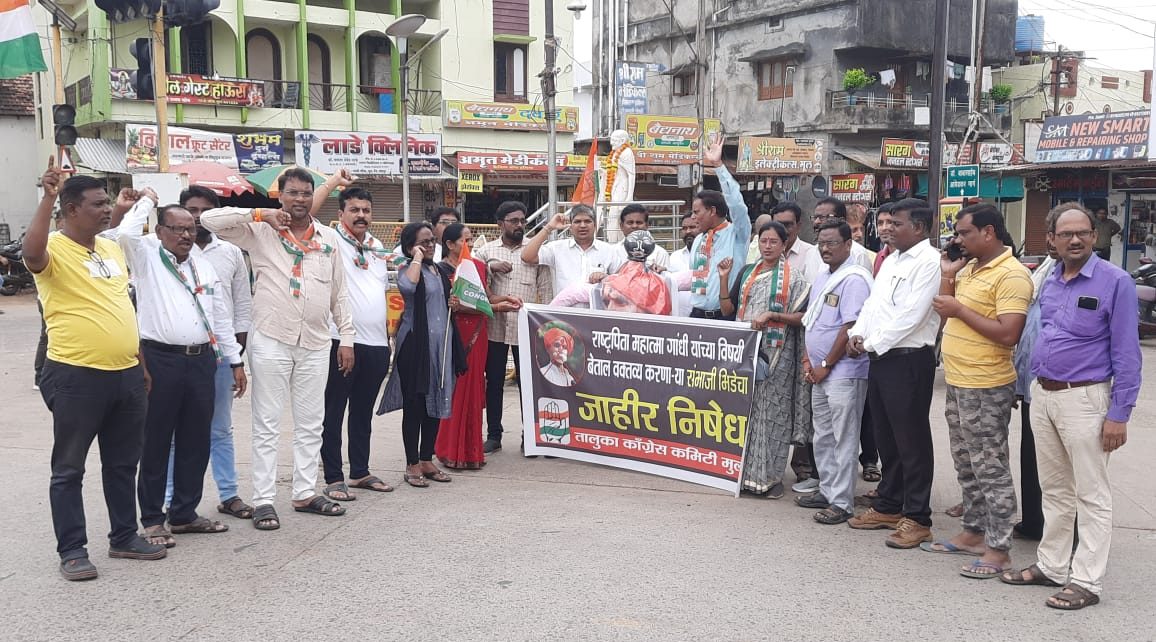 मूल : राष्ट्रपिता महात्मा गांधी यांचे बद्दल अवमानकारक वक्तव्य करून प्रक्षोभक विधानाने सामाजिक एकोपा भंग करू पाहणाऱ्या संभाजी भिडे यांचे विरूध्द कायदेशीर कारवाई करण्यासाठी तालुका व शहर काँग्रेस पार्टीच्या वतीने भिडे यांच्या प्रतिमेला जोडो मारत निषेध करण्यात आला. जिल्हा मध्यवर्ती सहकारी बँकेचे अध्यक्ष तथा काँग्रेस नेते संतोषसिंह रावत यांचे नेतृत्वात स्थानिक गांधी चौकात संभाजी भिडे यांच्या निषेधाचे फलक हाती घेत निदर्शने करण्यात आले. संभाजी भिडेचे करायचे काय ? खाली डोक वरती पाय म्हणत भिडे विरूध्द घोषणा देण्यात आल्या. यावेळी काँग्रेसचे तालुका अध्यक्ष गुरू गुरनुले, शहर अध्यक्ष सुनिल शेरकी, ओबीसी सेलचे प्रदेश सरचिटणीस गुरू चौधरी, बाजार समिती सभापती राकेश रत्नावार आणि ज्येष्ठ कार्यकर्ते बंडु गुरनुले यांनी भिडे यांच्या आक्षेपार्ह विधानावर मत व्यक्त करतांना जाहीर निषेध नोंदविला. यावेळी उपस्थित महीला काँग्रेसच्या पदाधिका-यांनी संभाजी भिडे यांच्या प्रतिमेला जोडो मारत प्रतिकात्मक पुतळ्याचे दहन केले. यावेळी ठाणेदार सुमित परतेकी यांची भेट घेत संभाजी भिडे यांचेविरूध्द गुन्हा दाखल करून अटक करण्यासाठी निवेदन देण्यात आले. यावेळी बाजार समितीचे उपसभापती राजेंद्र कन्नमवार, महिला शहर अध्यक्ष नलीनी आडेपवार, बाजार समितीचे संचालक संदीप कारमवार, हसन वाढई, माजी नगर सेवक विनोद कामडे, लिना फुलझेले, सरपंच रविंद्र कामडे, स.प.जिल्हाध्यक्ष प्रा.विजय लोनबले, माजी प.स.सदश्य डाँ. पदमाकर लेनगुरे, महीला साचिव शामला बेलसरे, उपाध्यक्ष वैशाली काळे, उमा बेलसरे, उपाध्यक्ष कैलास चलाख, सोसायटी संचालक विवेक मुत्यलवार, किसान काँग्रेस सेलचे अध्यक्ष रूमदेव गोहणें , विष्णु सादमवार, ईश्वर लोनबले, निलेश माथनकर, आकाश दहीवले, सुरेश फुलझेले, संदीप मोहबे, अतुल जेंगठे आदी पदाधिकारी कार्यकर्ते उपस्थित होते.