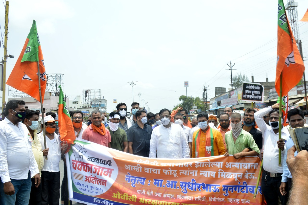 चंद्रपूर जिल्हा भाजपातर्फे आज ओबीसी समाजाला राजकीय आरक्षण पुन्हा देण्याच्या मागणीसाठी पडोली चौकात चक्काजाम आंदोलन करण्यात आले. याप्रसंगी बोलताना आ. मुनगंटीवार म्हणाले, कुठल्याही समाजाला न्याय देण्यास हे सरकार असमर्थ आहे अशी कृती सरकार स्थापन झाल्यापासून यांनी केली आहे. याकरता न्यायालयात पुनर्विचार याचिका दाखल करण्याची मागणी भाजपाने केली आहे. आणखी एक महत्वाची घोषणा करताना आ. मुनगंटीवार म्हणाले की १९ जुलैला महाराष्ट्रातील जिल्हा परिषदांमध्ये अतिरिक्त ठरलेल्या ओबीसी जागांसाठी होणा-या पोटनिवडणूकांमध्ये भाजपा महाराष्ट्र सर्व जागी ओबीसी उमेदवारच उभे करेल व या दृष्टीने ओबीसी समाजाला न्याय देण्याचा प्रयत्न करेल.