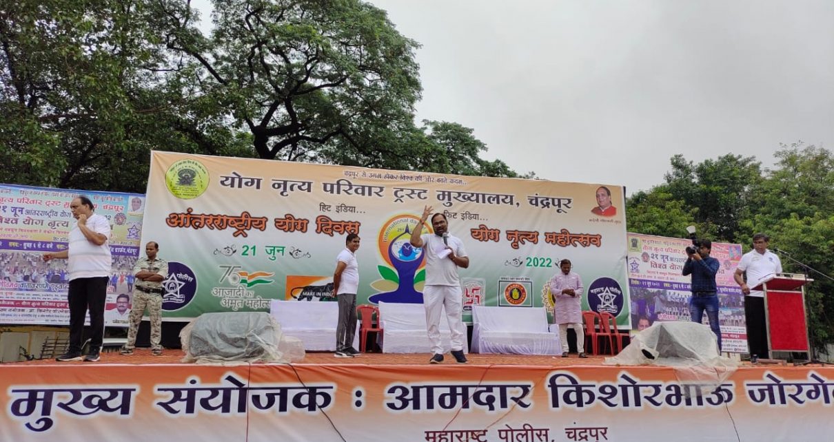 आज मंगळवारी जागतिक योग दिनानिमित्त योग नृत्य परिवार ट्रस्ट यांच्या वतीने तर यंग चांदा ब्रिगेड यांच्या संयोजनाने पोलिस मैदान येथे विश्व योग नृत्य महोत्सवाचे आयोजन करण्यात आले होते. या प्रसंगी ते बोलत होते. या महोत्सवाला रामनगर पोलिस ठाण्याचे पोलीस निरीक्षक राजेश मुळे, डॉ. गोपाल मुंदडा, आकाश घोडमारे, आशिष झा, ऐकाडे, सुरेश घोडके, प्रशांत कत्तुलवार, शशिकांत मस्के, जितेंद्र ईजगोरवार, यांच्यासह यंग चांदा ब्रिगेडचे जिल्हा महानगर अध्यक्ष पंकज गुप्ता, महिला शहर संघटिका वंदना हातगावकर, प्रा. श्याम हेडाऊ, विश्वजित शाहा, अमोल शेंडे, राम जंगम, विलास वनकर, विलास सोमलवार युवती प्रमुख भाग्यश्री हांडे आदिंची उपस्थिती होती.