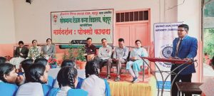 जिल्हा विधी सेवा प्राधिकरणाचे सचिव सुमित जोशी यांनी न्यायव्यवस्था व त्यानुसार विधी सेवा प्राधिकरण व प्राधिकरणामार्फत दिल्या जाणाऱ्या सर्व सेवा आणि योजना याबाबत मार्गदर्शन करून वेगवेगळ्या उदाहरणातून कायदा व त्यातील तरतुदी समजावून सांगितल्या.