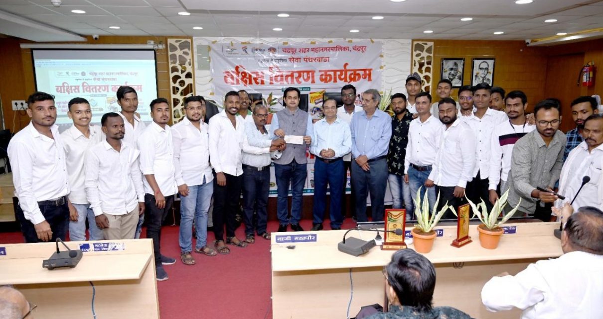 चंद्रपूर  – स्वातंत्र्याचा अमृत महोत्सव अंतर्गत चंद्रपूर महानगरपालिकेमार्फत आयोजीत करण्यात आलेल्या गणेशोत्सव देखावे, निबंध स्पर्धा, सेल्फी विथ तिरंगा, क्रीएटीव्ह व्हिडिओ स्पर्धांचे बक्षीस वितरण २ ऑक्टोबर रोजी मनपा राणी हिराई सभागृहात पार पडले. आयुक्त विपीन पालीवाल यांच्या हस्ते सर्व विजेत्यांना बक्षीस हे धनादेशाद्वारे देण्यात आले .